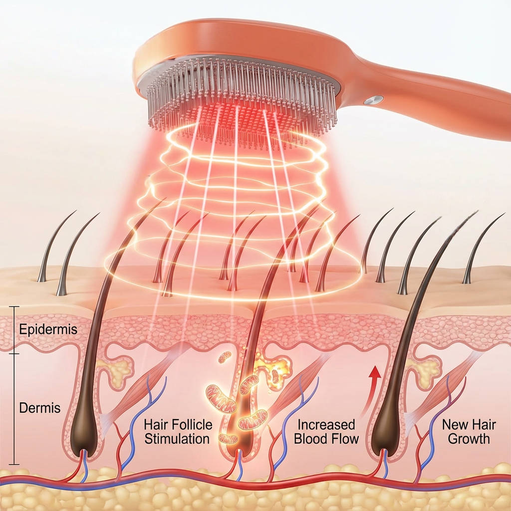 Czerwone światło LED dociera do głębszych warstw skóry, stymulując komórki do regeneracji i poprawiając mikrokrążenie. Na skórze głowy wspiera aktywność mieszków włosowych, co może wzmacniać włosy i poprawiać ich gęstość. Na skórze ciała sprzyja odnowie, ujędrnia i pomaga zmniejszać widoczność oznak starzenia oraz utraty elastyczności tkanek.